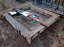 Когда подготовительные работы на территории могилы были завершены, мы принялись за укладку брусчатки на пескобетон, сама плитка была уложена вровень с облицованным гранитными плитами цоколем. Параллельно с этим мы подготовили основание для последующей установки надгробья.